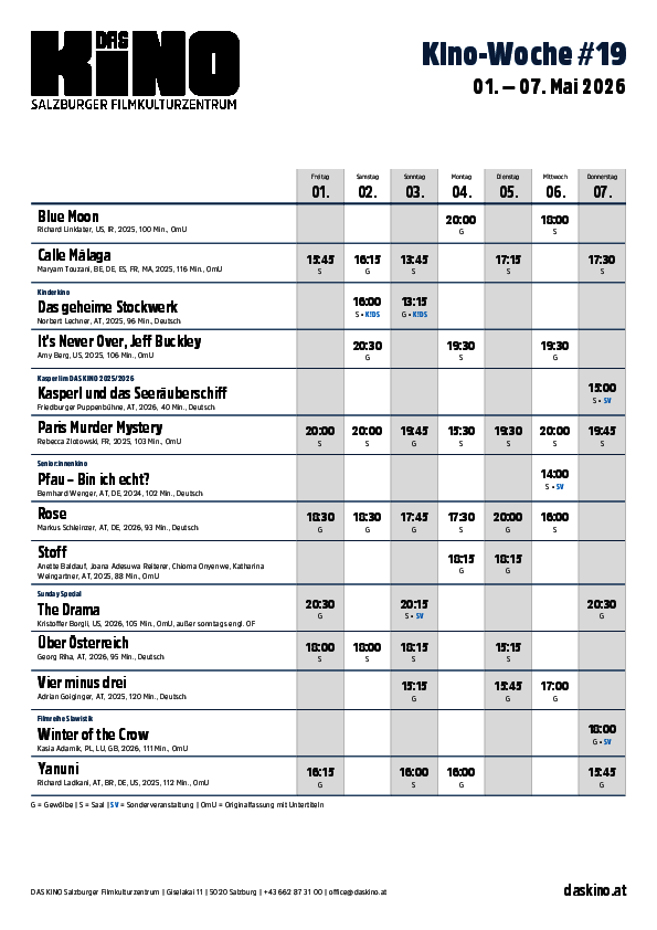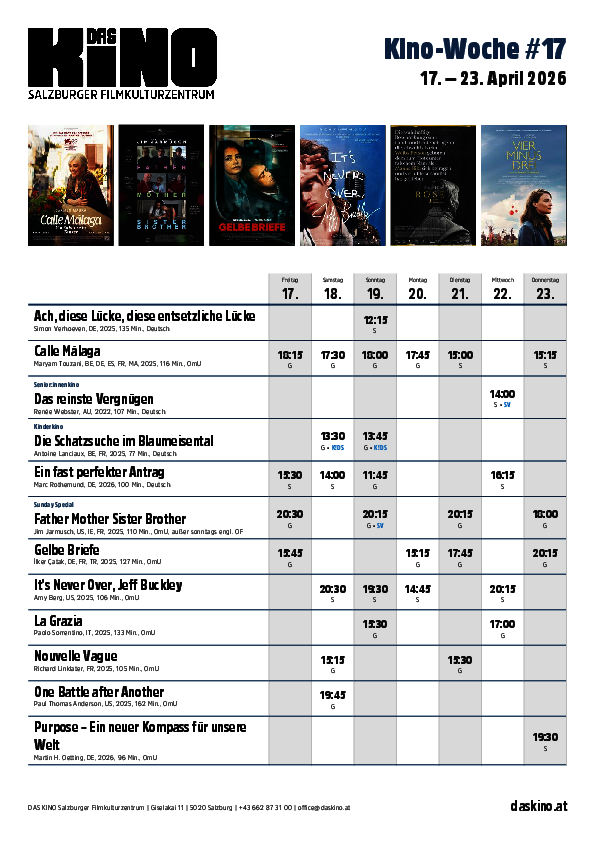 Wir, Salzburger Filmkulturzentrum DAS KINO (Firmensitz: Österreich), würden gerne mit externen Diensten personenbezogene Daten verarbeiten. Dies ist für die Nutzung der Website nicht notwendig, ermöglicht uns aber eine noch engere Interaktion mit Ihnen. Falls gewünscht, treffen Sie bitte eine Auswahl: