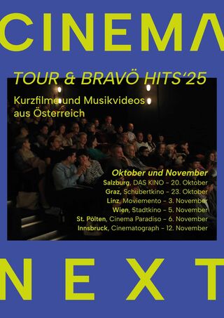 2025 bringt Cinema Next zwei Veranstaltungsformate erstmals zusammen: die TOUR und die BRAVÖ HITS: Es werden Kurzfilme gezeigt, die aktuelle Themen und persönliche Zugänge der Filmschaffenden sichtbar machen. Im zweiten Teil des Abends richtet sich der Fokus auf heimische Musikvideos. Eine dreiköpfige, lokale Jury wählt am Ende des Abends zwei Lieblingsfilme aus den jeweiligen Programmen. Außerdem wird der „Arbeitswelten- Förderpreis“ der Arbeiterkammer Salzburg verliehen sowie das Jahresstipendium Film des Landes Salzburgs.
